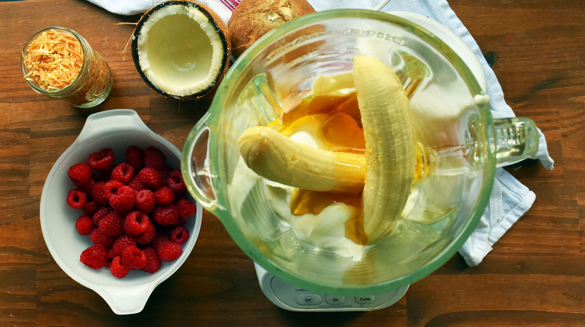 This particular smoothie recipe is a family favorite because it combines tart raspberries with sweet coconut in a simple yogurt and honey base. Frozen banana eliminates the need for ice and adds more needed nutrition for those busy days. We top ours with crunchy caramel bits, pecans or walnuts, and toasted coconut for the perfect bit of crunch. And, of course, a bit of shaved dark chocolate! It is a delicious breakfast easy to get out quickly on those busy mornings that seem to run in slow motion.